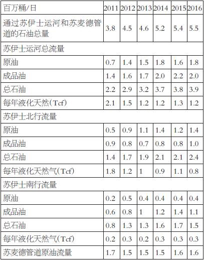 表為2011—2016年蘇伊士運河和蘇麥德管道石油和液化天然氣流量表為2011—2016年蘇伊士運河和蘇麥德管道石油和液化天然氣流量