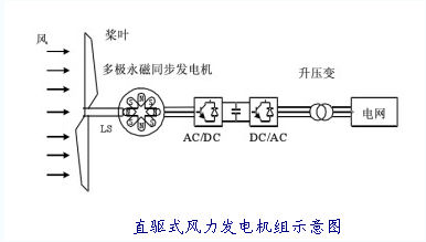 直驅式風(fēng)力發(fā)電機組的風(fēng)輪直接驅動(dòng)發(fā)電機,主要由風(fēng)輪、傳動(dòng)裝置、發(fā)電機、控制系統等組成。為了提高低速發(fā)電機效率,直驅式風(fēng)力發(fā)電機組采用大幅度增加極對數(一般極數提高到100左右)來(lái)提高風(fēng)能利用率,采用全功率變流器實(shí)現風(fēng)力發(fā)電機的調速。