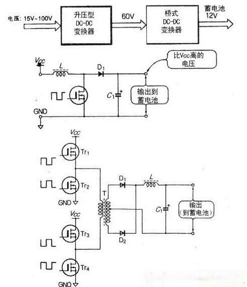 這是面向槳葉直徑達2m的風(fēng)力發(fā)電機充電電路。風(fēng)力發(fā)電機輸出電壓為15V一100V,對如此懸殊的輸入電壓范圍,采用了上圖的電路結構。在風(fēng)力發(fā)電機輸出電壓低時(shí),用斬波型升壓電路(中圖)把電壓升至60V,再經(jīng)全橋DC-DC變換器(下圖)轉換為蓄電池電壓。當發(fā)電機電壓在60V以上時(shí),升壓電路不工作,直接由全橋變換器轉換風(fēng)力發(fā)電機。