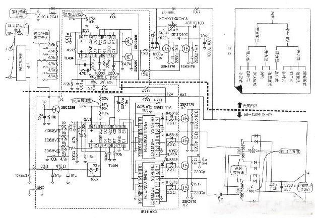 本電路最大輸出時(shí)效率達80%—90%,若輸出500w,則有50W—100W功耗,這些都轉化為晶體管、變壓器、電感、二極管的熱量。為散熱,設置了自動(dòng)感溫的排氣扇。本電路輸出30W—400W的效率達85%。