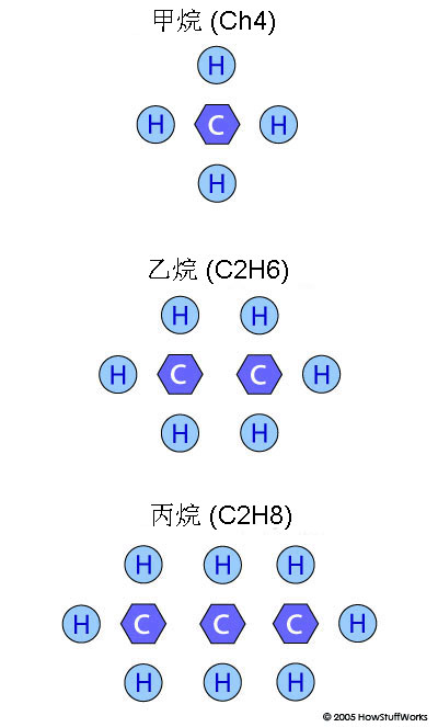 天然氣主要由甲烷以及其他烴氣組成。 烴是僅包含碳元素和氫元素的有機化合物。 天然氣中的烴稱(chēng)為飽和烴,因為它們所包含的碳和氫以單鍵相連成鏈。 如下圖所示,甲烷是最簡(jiǎn)單的飽和烴。