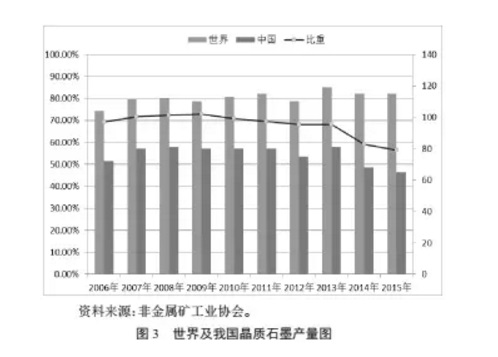 全球共有十幾個(gè)國家開(kāi)發(fā)石墨礦產(chǎn),中國、印度和巴西是世界主要石墨生產(chǎn)國,我國一直是世界最大的石墨生產(chǎn)國,石墨產(chǎn)量多年居世界首位,產(chǎn)量占世界比重在70%左右,2009年后,我國石墨產(chǎn)量占世界比重有所下降,2015年產(chǎn)量占世界比重為56%。