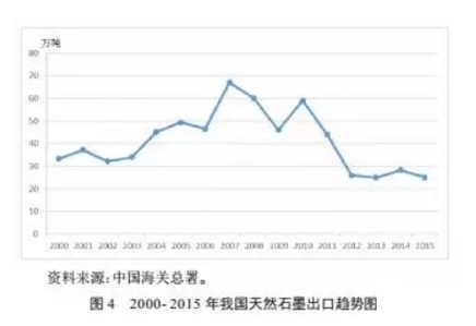 我國是世界石墨貿易的主要國家之一,石墨是我國傳統出口商品,出口量占世界70%以上。據海關(guān)統計資料,我國天然石墨出口量呈現先增后減的波動(dòng)態(tài)勢,2007年出口量為67萬(wàn)噸,達到近15年來(lái)的最高值,隨后波動(dòng)下降,2015年出口量降至25萬(wàn)噸。