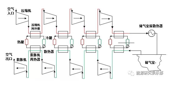 該系統同絕熱壓縮空氣儲能系統的區別在于該系統在壓縮過(guò)程級間換熱及儲熱,絕熱壓縮空氣儲能在全部壓縮過(guò)程結束后儲熱。相較于絕熱壓縮空氣儲能,蓄熱式壓縮空氣儲能系統的儲熱溫度及儲能密度較低,但其壓縮機耗能減小,且對于壓縮機材料要求不高。該系統缺點(diǎn)在于增加了多級換熱及儲熱,系統初投資有所增加。