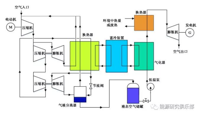 該系統將電能轉化為液態(tài)空氣的內能以實(shí)現能量存儲的技術(shù)。儲能時(shí),系統驅動(dòng)空氣分離及液化裝置,產(chǎn)生液化空氣,儲存于低溫儲罐中;釋能時(shí),將低溫儲罐中液態(tài)空氣加壓吸熱,隨后驅動(dòng)透平發(fā)電。由于空氣的液化存儲,大幅減少存儲裝置尺寸,從而不需要大型儲氣室。