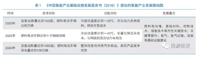 在氫能和燃料電池發(fā)展方面,我國也一直不落后。2016?年?10?月,中國標準化研究院資源與環(huán)境分院和中國電器工業(yè)協(xié)會(huì )發(fā)布的《中國氫能產(chǎn)業(yè)基礎設施發(fā)展藍皮書(shū)(2016)》首次提出了我國氫能產(chǎn)業(yè)的發(fā)展路線(xiàn)圖(表?1)。對我國中長(cháng)期加氫站和燃料電池車(chē)輛發(fā)展目標進(jìn)行了規劃?!吨袊圃?2025》明確提出燃料電池汽車(chē)發(fā)展規劃,更是將發(fā)展氫燃料電池提升到了戰略高度。目前不論是國內的氫能技術(shù),還是氫能產(chǎn)業(yè)基礎,雖然都具有一定的戰略規模,但是與國際最先進(jìn)水平還有一定的差距。