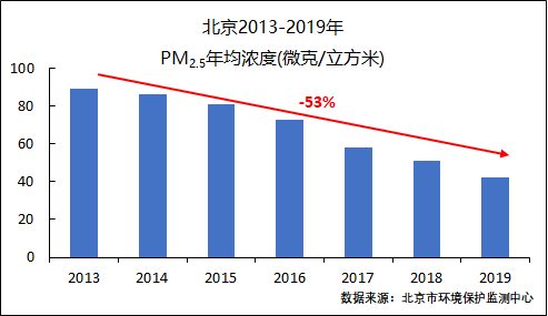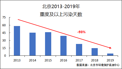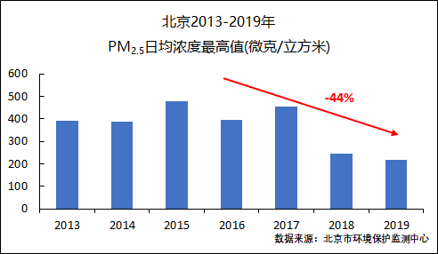 第二個(gè)是“霧霾重污染”和“PM2.5年均濃度達標”的概念混淆。我們知道,同樣的排放量,碰上氣象條件非常不利,PM2.5濃度就會(huì )很高;如果氣象條件比較有利,PM2.5濃度就會(huì )很低。剛剛過(guò)去的這幾天,我們也經(jīng)歷了PM2.5濃度的“過(guò)山車(chē)”,2月13日北京PM2.5濃度還是197微克/立方米,到了2月15日就降到了6微克/立方米,就這兩天而言,北京大氣容量的差異高達30倍以上。“容量論文”并沒(méi)有討論“污染物排放降低到什么程度,我們就不會(huì )有重污染”這樣的極端情景,而是討論“給定氣象條件和污染源排放分布格局下,污染物排放降低到什么程度,我們的PM2.5濃度能基本達標”這一全年平均的情景。當然,隨著(zhù)全年P(guān)M2.5濃度的下降,霧霾重污染的頻率、長(cháng)度和強度都會(huì )降低。以北京為例,從2013年到2019年,PM2.5年均濃度從89微克/立方米下降到42微克/立方米,PM2.5日均濃度的最高值也從400微克/立方米左右下降到200微克/立方米左右(見(jiàn)下圖),重污染天數從58天減少到4天。我們認為堅持目前的工作方向不動(dòng)搖,霧霾重污染將進(jìn)一步減少,直至基本消除。