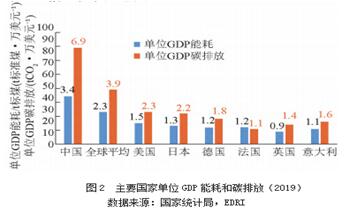 目前,我國單位GDP碳排放量是全球平均水平的1.8倍,單位GDP能耗是全球平均的1.5倍(如圖2所示)。如果我國能源利用效率能從3.4噸標準煤/萬(wàn)美元降到2.3噸標準煤/萬(wàn)美元,則可直接節約15億噸標準煤,減少碳排放約39億噸??梢?jiàn),未來(lái)我國節能提效仍具有很大的潛力與空間,我們必須堅持貫徹落實(shí)節能優(yōu)先的方針,大力推進(jìn)能效提升,加快實(shí)現節約發(fā)展。