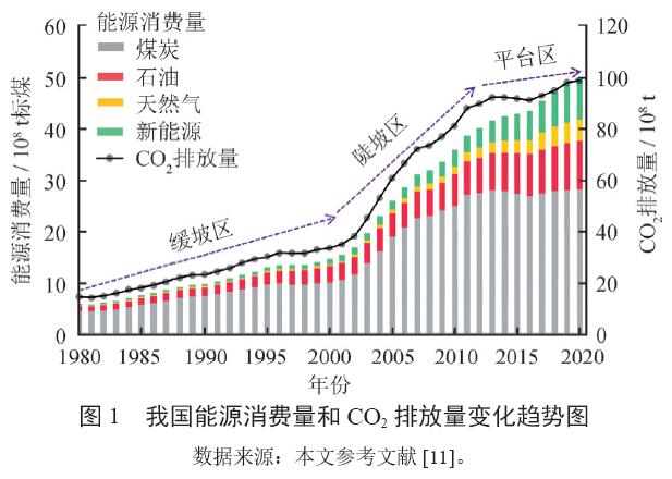 我國能源消費和CO2排放大致經(jīng)歷了緩慢發(fā)展(緩坡區)、快速發(fā)展(陡坡區)和平穩發(fā)展(平臺區)3個(gè)階段(圖1)。1980—2001年,我國能源消費處于緩坡區,能源消費量年均新增0.43×108 t標煤,CO2排放量年均新增0.93×108 t,年增CO2排放量與年增能源消費量比值為2.2;2002—2013年,我國能源消費處于陡坡區,能源消費量年均新增2.06×108 t標煤,CO2排放量年均新增4.50×108 t,年增CO2排放量與年增能源消費量比值為2.2;2014—2020年,我國能源消費處于平臺區,能源消費量年均新增1.12×108 t標煤,CO2排放量年均新增0.81×108 t,年增CO2排放量與年增能源消費量比值為0.7。目前我國能源生產(chǎn)與消費結構中,主體偏煤炭、油氣偏輕、新能源偏少,中國實(shí)現碳中和需要將現階段以煤炭為主的“一大三小”能源消費結構,轉型為以新能源為主的“三小一大”結構,但在實(shí)施過(guò)程中將面臨以下三大挑戰:①能源轉型規模大,碳中和實(shí)現周期較短(僅有40年左右時(shí)間),能否按期實(shí)現能源結構轉型存在很大困難;②能源轉型過(guò)程存在著(zhù)能源供應安全的不確定性、能源利用的經(jīng)濟性、能源顛覆性技術(shù)的難預測性等問(wèn)題;③能源轉型后,以新能源為主的“三小一大”能源結構,可能面臨新的關(guān)鍵技術(shù)“卡脖子”和關(guān)鍵礦產(chǎn)資源“斷鏈子”等難題。