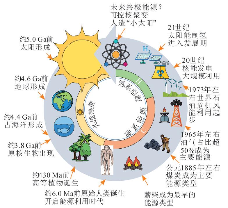 構建以碳中和為目標的世界能源體系是“碳中和學(xué)”的理論核心和首要任務(wù)。地球能源始于生物在太陽(yáng)下的繁盛、滅絕、埋藏和演化,并與地球系統同步演進(jìn),最終轉向“人造太陽(yáng)”(可控核聚變),完成能源“從太陽(yáng)中來(lái)、回太陽(yáng)中去”的終極循環(huán)(圖2)。碳中和目標下,將形成以清潔、無(wú)碳、智能、高效為核心的“新能源”+“智能源”體系的能源發(fā)展目標:能源體系的主體要素將發(fā)生根本性轉變,能源形態(tài)將從化石能源向新能源,從有碳向無(wú)碳轉變。能源技術(shù)將從資源優(yōu)勢占主導地位的能源資源型,轉變?yōu)榧夹g(shù)優(yōu)勢占主導地位的能源技術(shù)型;能源結構將從以一次能源直接消費為主,調整至電氣化二次能源消費為主;能源管理將從集中式利用,發(fā)展為智能化平衡用能。碳中和目標符合能源學(xué)研究主旨,從資源角度揭示地球系統內化石能源與非化石新能源共生分布關(guān)系、碳系能源與氫系能源有序接替轉型、能源體系與綠色地球和諧發(fā)展的自然變化規律。