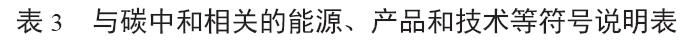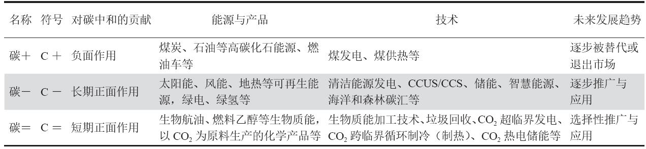 CO2主要來(lái)源于能源消費、農林用地、土地利用、垃圾排放等。利用生態(tài)系統碳匯、CO2生產(chǎn)化工產(chǎn)品、CO2人工綠色轉化、CO2地質(zhì)驅油等技術(shù),可以增加“灰碳”的利用率,有效減少大氣中CO2的濃度。在碳中和目標下,以CCUS/CCS為核心的碳工業(yè)技術(shù)體系涵蓋碳捕集、碳運輸、碳驅油、碳封存、碳產(chǎn)品、碳金融等業(yè)務(wù),是徹底消除“黑碳”的革命性技術(shù)(圖3、表2)。因此,以CCUS/CCS為基礎的低成本、高能效的碳工業(yè)將是世界各國實(shí)現碳中和目標的關(guān)鍵產(chǎn)業(yè)和新興產(chǎn)業(yè)之一。未來(lái)它將利用地下具有巨量?jì)臻g的枯竭性油田、氣田、水田等為碳中和做出大貢獻。此外,建立和完善碳稅制度、碳交易制度、復合碳排放權交易體系、財政補貼等碳經(jīng)濟與政策杠桿,有效控制CO2排放量。根據對碳中和貢獻程度的不同,形成“CO2=0”“碳+”(或“C+”)、“碳-”(或“C-”)、“碳=”(或“C=”)符號(圖4、表3)。“CO2=0”對應碳中和,即CO2排放量與吸收量相抵消。“碳+”對應于不符合碳中和發(fā)展要求的高能耗、高碳排放的能源、產(chǎn)品或技術(shù),對碳中和具有負面作用,并將逐步被替代或退出市場(chǎng),例如煤炭、石油等高碳化石能源和燃油車(chē)等能源與產(chǎn)品,以及煤發(fā)電、燃煤供熱等技術(shù)。“碳-”對應符合碳中和發(fā)展要求的綠色低碳能源、產(chǎn)品或技術(shù),對碳中和具有長(cháng)期正面作用,未來(lái)將逐步得到推廣與應用,例如太陽(yáng)能、風(fēng)能、地熱等可再生能源和可再生能源產(chǎn)生的綠電、綠氫等能源與產(chǎn)品,以及清潔能源發(fā)電、CCUS、儲能、智慧能源、海洋和森林碳匯等技術(shù)。“碳=”對應于CO2作為重要的循環(huán)介質(zhì),短期內能夠達到減少碳排放效果的能源、產(chǎn)品或技術(shù),對碳中和具有短期的正面作用,未來(lái)或將被選擇性推廣與應用,如生物航油、燃料乙醇等和以CO2為原料生產(chǎn)的化學(xué)產(chǎn)品等能源與產(chǎn)品,以及生物質(zhì)能加工技術(shù)、垃圾回收、CO2超臨界發(fā)電、CO2跨臨界循環(huán)制冷(制熱)、CO2熱電儲能等技術(shù)。