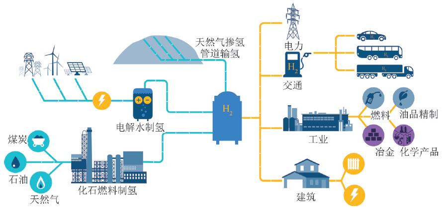 氫能是最清潔的二次能源,是后石油時(shí)代最理想的能量載體。在碳中和目標下,需建設與煤炭工業(yè)、石油工業(yè)類(lèi)似的全產(chǎn)業(yè)鏈氫工業(yè)體系,以綠氫為核心,涵蓋氫制備、氫儲存、氫運輸、氫加注、氫利用、氫檢測及氫安全等業(yè)務(wù),涉及氫交通、氫儲能、氫化工、氫冶金等領(lǐng)域。目前,絕大部分氫能都來(lái)源于化石燃料,主要應用于工業(yè)領(lǐng)域,如煉油、合成氨、制甲醇、煉鋼等,在交通、發(fā)電、建筑等領(lǐng)域尚未大規模推廣應用。當前,氫能應用成本較高是制約氫能在發(fā)電、工業(yè)和民用領(lǐng)域推廣應用的主要原因之一。預計到2030年,綠氫的生產(chǎn)成本將下降30%,綠氫的價(jià)格有望低于化石燃料制氫。2050年,預計全球氫能在終端能源消費結構中的占比將達18%左右,氫能將大規模應用于難以通過(guò)電氣化實(shí)現“零碳排放”的工業(yè)、長(cháng)距離交通運輸等領(lǐng)域。以綠氫為核心的氫工業(yè)將替代以石油為核心的油氣工業(yè),形成可再生能源制氫,并建立完整的制備、儲運、燃料電池用氫和加氫站為一體的氫能產(chǎn)業(yè)鏈,氫能將廣泛應用于發(fā)電、工業(yè)、建筑和交通等重點(diǎn)領(lǐng)域(圖5、表4)。