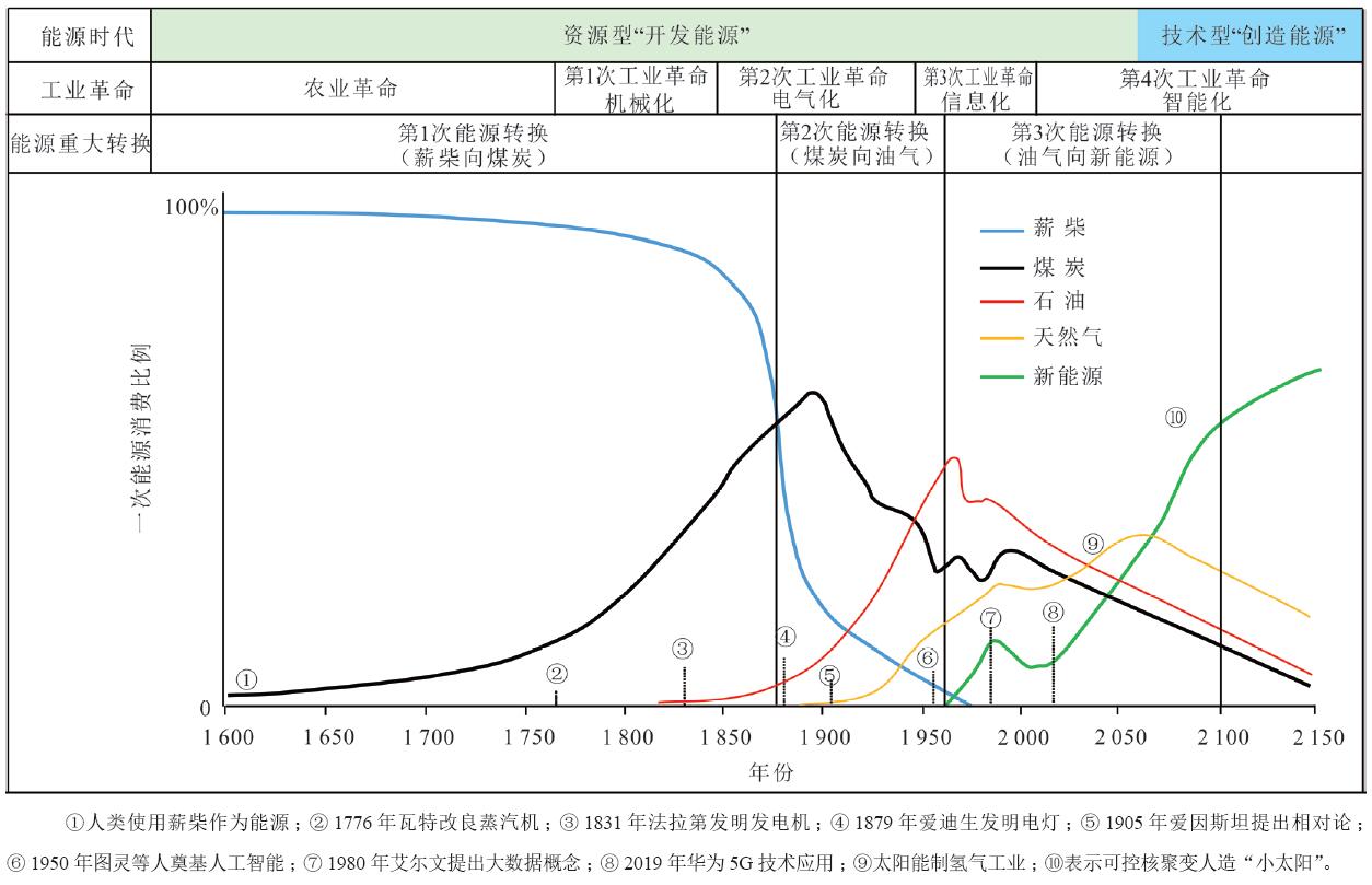 碳中和是一場(chǎng)綠色化的工業(yè)革命。自進(jìn)入工業(yè)革命以來(lái),人類(lèi)社會(huì )經(jīng)歷了機械化、電氣化和信息化的3次工業(yè)革命,目前以大數據和人工智能為代表的先進(jìn)信息技術(shù)掀起了第4次工業(yè)革命浪潮(圖6)。在碳中和目標下,此次工業(yè)革命將改變傳統的高碳、粗放的發(fā)展模式,加快構建低碳、環(huán)保、高效的綠色發(fā)展模式。碳中和引發(fā)的科技革命將對社會(huì )與經(jīng)濟發(fā)展產(chǎn)生重大變革,其意義不亞于之前的工業(yè)革命。碳中和主要通過(guò)碳減排、碳轉移、碳轉化3種路徑來(lái)實(shí)現,具體內容包括:①加大可再生能源利用,提高能源利用效率,從而實(shí)現碳減排;②大力發(fā)展和推廣應用CO2埋藏與驅油技術(shù),達到碳轉移目的;③推動(dòng)以CO2為原料的化工產(chǎn)業(yè),生產(chǎn)甲醇、尿素和可降解塑料等產(chǎn)品,最大限度地實(shí)現碳轉化。在碳中和目標下,人類(lèi)工業(yè)化過(guò)程中將催生以CCUS為核心的碳工業(yè)和以綠氫為核心的氫工業(yè)等新興產(chǎn)業(yè)。
