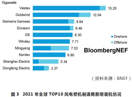 從市場(chǎng)份額情況看,自2010年之后,國際風(fēng)機制造商在中國市場(chǎng)的占有率不斷走低。據BNEF數據,2021年西門(mén)子歌美颯排名下滑至第六,取而代之的是中國整機制造商的崛起。近兩年以來(lái),中國在“雙碳”目標的引領(lǐng)下,海上風(fēng)電優(yōu)勢盡顯,發(fā)展速度加快。