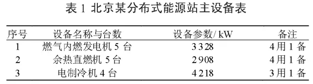 該數據中心項目包含綜合辦公區和數據中心區兩個(gè)區域,數據中心分布式能源站(見(jiàn)表1)為數據中心供電、項目全年供冷和冬季供熱等能源服務(wù)。項目電負荷為14323kW,冷負荷為10100kW,全年用電量為10014.65×104kW˙h,全年制冷量為31.43×104GJ。
