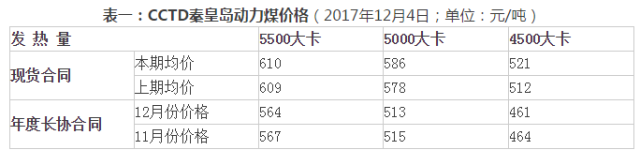 本報告期(11月25日至12月1日,見(jiàn)表一),“CCTD秦皇島動(dòng)力煤價(jià)格”所采集的環(huán)渤海地區各種現貨動(dòng)力煤價(jià)格整體上呈現止跌跡象,低熱值現貨動(dòng)力煤價(jià)格則略有回升。其中,CCTD5500報收于610元/噸,比11月27發(fā)布的價(jià)格上漲了1元/噸;CCTD5000報收于586元/噸,比11月27發(fā)布的價(jià)格上漲了8元/噸。