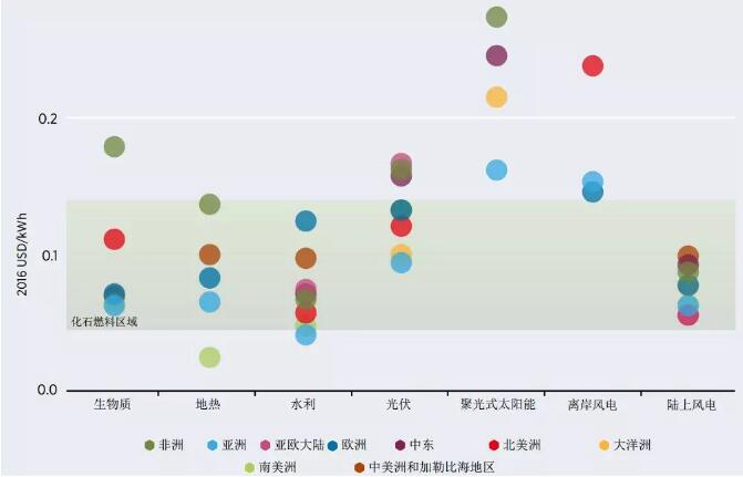 在可再生能源資源具備經(jīng)濟性的未開(kāi)發(fā)地區,生物質(zhì)能、水電和陸上風(fēng)能都能提供低成本的電力。太陽(yáng)能光伏發(fā)電(PV)、海上風(fēng)電和聚光式太陽(yáng)能發(fā)電(CSP)的電力成本也在近期快速下降。這意味著(zhù)無(wú)論是現在還是未來(lái)幾年,當這些可再生能源電站投入運行時(shí),可再生能源技術(shù)可以提供有競爭力的電力。