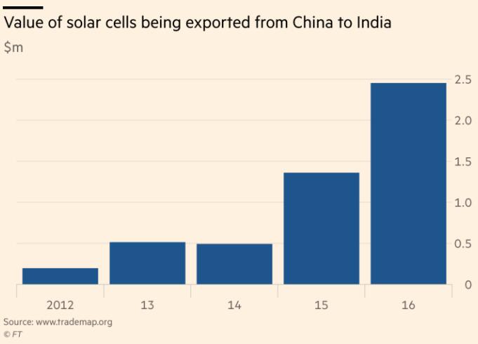 為保護本土太陽(yáng)能電池板制造商免受定價(jià)低廉的中國競爭對手傷害,印度擬對進(jìn)口自中國的電池板開(kāi)征稅率為70%的進(jìn)口關(guān)稅。