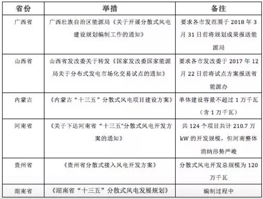 在“三北”地區棄風(fēng)限電形勢嚴峻以及市場(chǎng)上優(yōu)質(zhì)集中式項目逐步開(kāi)發(fā)殆盡的情況下,風(fēng)電從集中大規模連片開(kāi)發(fā)轉向集中式和分散式協(xié)同發(fā)展勢在必行, 2017年5月國家能源局發(fā)布了《關(guān)于加快推進(jìn)分散式接入風(fēng)電項目建設有關(guān)要求的通知》,要求各省級能源主管部門(mén)制定分散式風(fēng)電發(fā)展方案,明確分散式風(fēng)電項目不受年度指導規模限制。隨后各省加快了制定分散式風(fēng)電發(fā)展方案的步伐,目前已明確編制分散式風(fēng)電建設規劃的省份有:廣西、山西、內蒙古、河南、貴州和湖南。