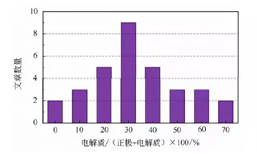 圖5. 2017 年發(fā)表的全固態(tài)鋰電池中固態(tài)電解質(zhì)與正極活 性材料加固態(tài)電解質(zhì)材料的質(zhì)量占比的文章數量統計