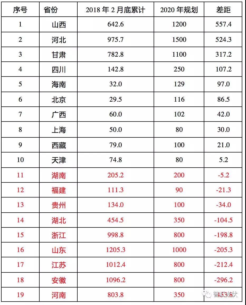 本文將20省截止2018年2月份各省的實(shí)際裝機數據與其“十三五”能源發(fā)展規劃、電力發(fā)展規劃、可再生能源發(fā)展規劃中的目標進(jìn)行對比,發(fā)現全國至少有9個(gè)省份,光伏實(shí)際裝機規模已經(jīng)超出“十三五”規劃,具體如下表。
