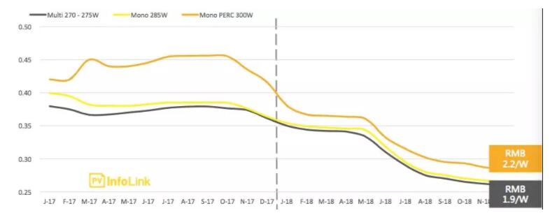 2017-18年組件歷史價(jià)格與預測(Unit: US$/W),來(lái)源:PV InfoLink