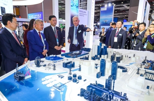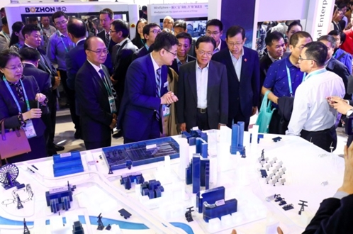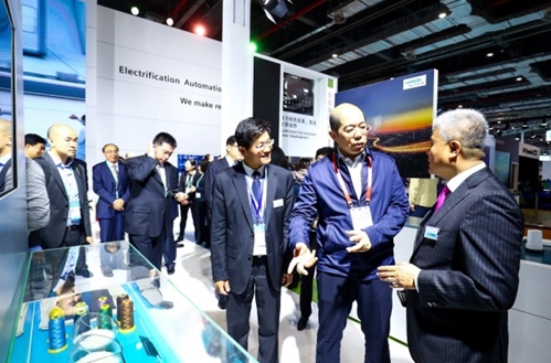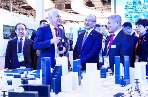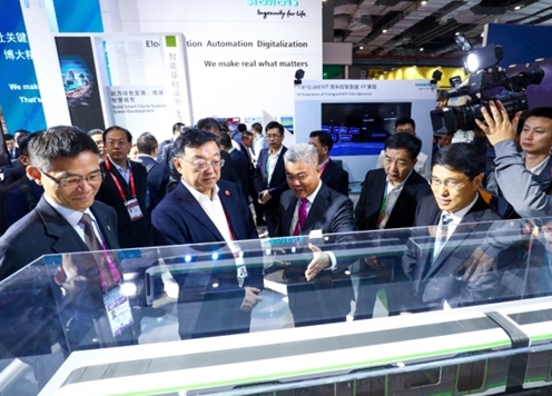 西門(mén)子大中華區首席執行官赫爾曼(Lothar Herrmann)陪同浙江省省長(cháng)袁家軍參觀(guān)西門(mén)子展臺。