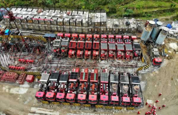 在長(cháng)寧H24平臺,記者看到,現場(chǎng)已經(jīng)完成了部分壓裂工作,幾十臺壓裂車(chē)、混砂車(chē)、供液車(chē)等整齊停放在工作區,場(chǎng)面甚是壯觀(guān)。據介紹,長(cháng)寧H24平臺共6口井,共設計179段,于2018年10月4日開(kāi)始壓裂,采用工廠(chǎng)化壓裂作業(yè)模式,截止到11月2日,已完成81段,壓裂時(shí)效2.7段/天,而業(yè)內的平均壓裂時(shí)效約為1.3段/天。
