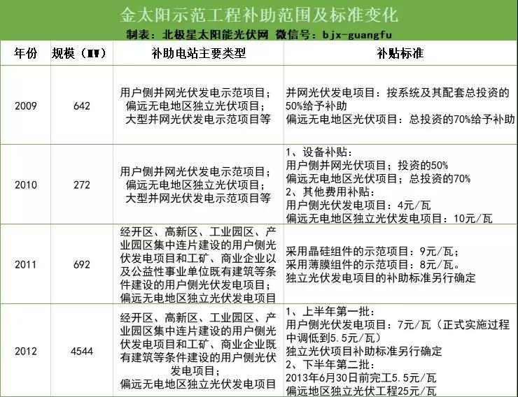 金太陽(yáng)工程:2009年7月,財政部、科技部、國家能源局聯(lián)合發(fā)布《關(guān)于實(shí)施金太陽(yáng)示范工程的通知》,計劃在2~3年內,采取財政補助方式支持不低于500MW的光伏發(fā)電示范項目。而具體的補助范圍和金額也在接下來(lái)的2009~2012年進(jìn)行了逐年調整,見(jiàn)下表: