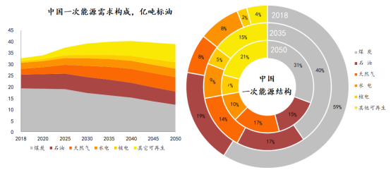 報告分析出:2035和2050年,我國非化石能源占比分別升至28%和37.8%,煤炭占一次能源需求的比重分別降至40.5%和30.7%。油氣占比在2035年后基本保持在31.5%左右;2035年,石油和天然氣占比分別為17.4%和14.2%;2050年,石油和天然氣占比分別15.2%和16.5%。