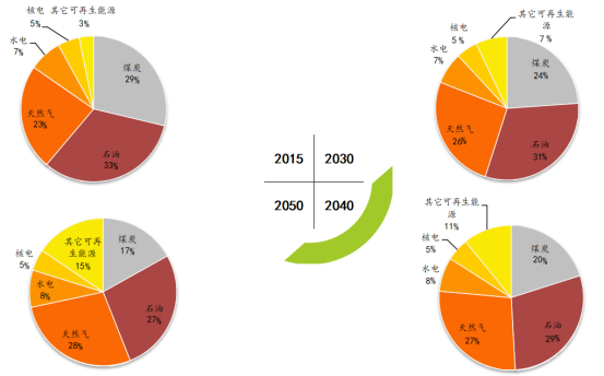 與之相對應的是,人們在終端用能的方面也會(huì )更側重清潔能源,煤炭和石油在能源消費終端的占比都會(huì )下降。到2050年,煤炭占比快速下滑至8%左右,石油占比從2015年的45%降至38%,天然氣和電力占比較快提升。到2050年,天然氣和電力占比將分別達22%和28%。