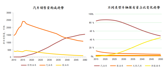 報告內容顯示:我國新能源汽車(chē)保有量占比將穩步提升,預計2035和2050年分別達到21.5%和44.2%。中國乘用車(chē)消費增速進(jìn)入換檔期,同時(shí)考慮節油技術(shù)進(jìn)步,汽油需求增速將逐步回落,預計在2025年前達峰;之后隨著(zhù)燃油效率提升、替代能源快速發(fā)展將穩步回落。