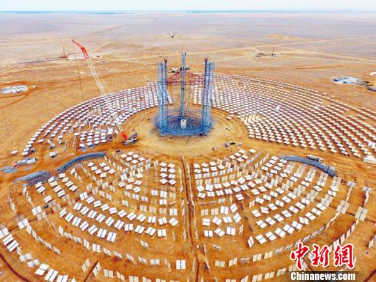 近年來(lái),甘肅酒泉市玉門(mén)市大力發(fā)展綠色新能源,繼風(fēng)電之后,光熱發(fā)電產(chǎn)業(yè)成為了玉門(mén)的新名片。圖為玉門(mén)鑫能5萬(wàn)千瓦光熱項目建設工地?!铌?yáng) 攝