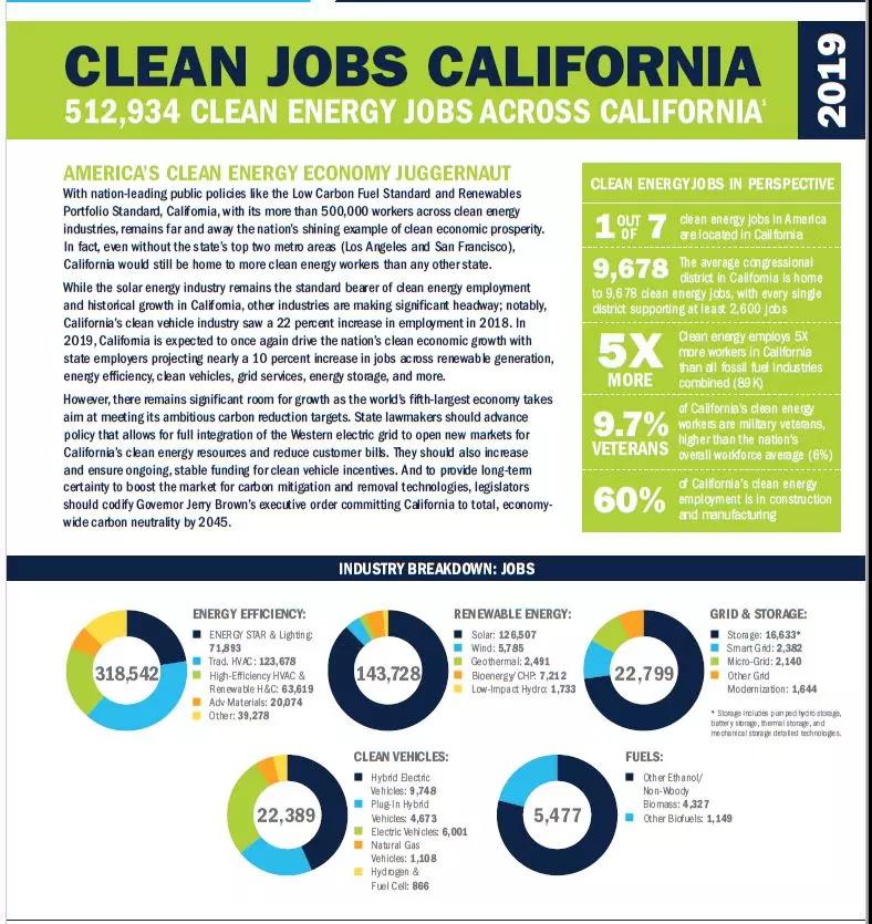 ——在全州范圍內,2018年清潔能源行業(yè)共有512,934個(gè)就業(yè)崗位。其中包括可再生能源就業(yè),如安裝太陽(yáng)能和風(fēng)能;建設電動(dòng)和混合動(dòng)力汽車(chē);在建筑物中進(jìn)行能源效率工作;制造清潔燃料和建設電池存儲項目。