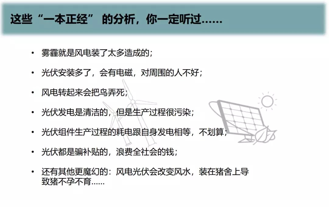 “這些一本正經(jīng)的分析,大家一定在過(guò)去幾年的報紙報道上看到過(guò)。比如說(shuō),北京霧霾這么嚴重,其中一個(gè)原因是風(fēng)電裝太多了,阻止風(fēng)進(jìn)入到北京,導致北京污染物擴散的比較慢。另外,像光伏安裝后,是不是有電磁輻射,對周?chē)瞬缓??另外,光伏組件生產(chǎn)過(guò)程耗電跟自身發(fā)電相等,是不是不劃算?或者光伏都是騙補貼,浪費全社會(huì )的錢(qián)……這些討論現在還在微博上被很多人傳播。針對這些問(wèn)題,我們在傳播領(lǐng)域已經(jīng)跟多家機構做了很多次合作,通過(guò)各種努力辟謠,但是我們行動(dòng)的速度比起謠言的傳播速度來(lái)說(shuō),差距還是很大的。