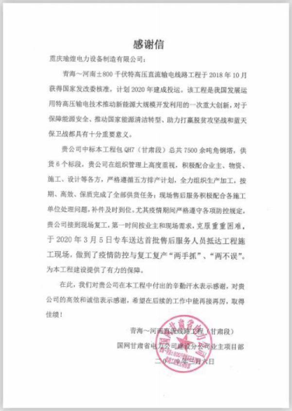 據悉,重慶順泰鐵塔制造有限公司瑜煌廠(chǎng)區近期收到國網(wǎng)甘肅省電力建設分公司業(yè)主項目部的感謝信,對重慶順泰按期、高效、保質(zhì)完成青?!幽?plusmn;800千伏特高壓直流輸電線(xiàn)路工程(甘肅段)供貨任務(wù),并在新冠肺炎疫情期間落實(shí)疫情防控與復工復產(chǎn)“兩手抓”、“兩不誤”,第一時(shí)間按照業(yè)主和現場(chǎng)需求,克服重重困難,派專(zhuān)車(chē)將首批售后服務(wù)人員送往施工現場(chǎng),為該工程建設提供有力保障表示感謝。