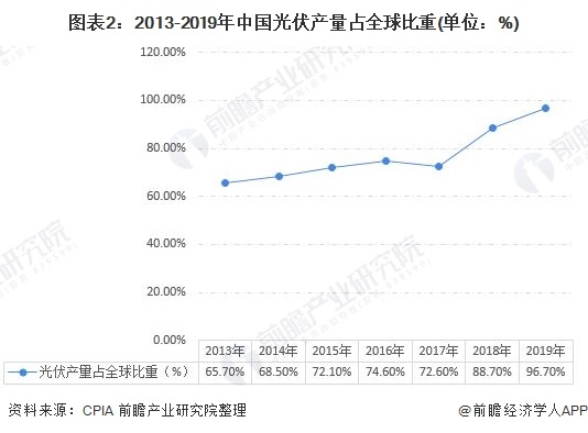 我國是光伏產(chǎn)業(yè)大國,擁有全球最完整的產(chǎn)業(yè)鏈。2019年,同期,盡管在政策調整下,我國光伏應用市場(chǎng)有所下滑,但受益于海外市場(chǎng)的增長(cháng),中國光伏各環(huán)節產(chǎn)業(yè)規模依舊保持了快速增長(cháng)勢頭。2019年,中國光伏組件產(chǎn)量達到了98.6GW,占全球產(chǎn)量比重不斷上升。作為全球最大光伏產(chǎn)品制造國及出口國,中國光伏裝機量、發(fā)電量已連續多年位列全球首位。
