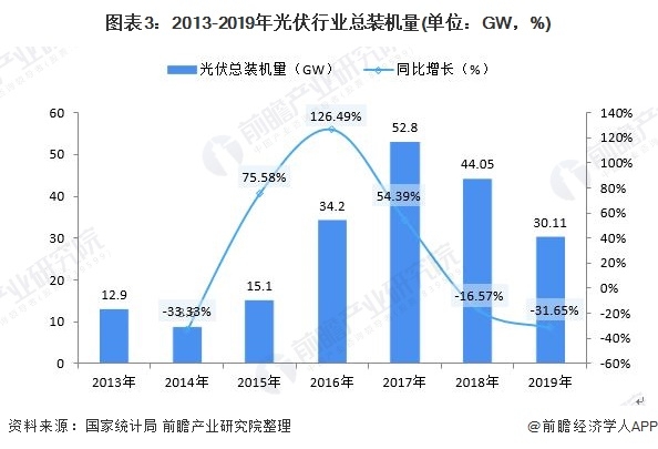 2013-2019年,光伏行業(yè)總裝機量呈現出波動(dòng)變化的趨勢。2013-2017年,呈現出波動(dòng)上升的趨勢,2017年,我國光伏行業(yè)裝機總量為52.8GW,為歷年最高值,2018-2019年,受政策影響,光伏行業(yè)裝機量驟減,2019年光伏行業(yè)裝機總量為30.11GW,較上年下降31.65%。