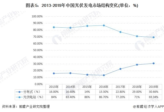 另從行業(yè)結構看,不同于光伏電站,分布式光伏發(fā)電是指在用戶(hù)所在場(chǎng)地或附近建設運行,以用戶(hù)側自發(fā)自用為主、多余電量上網(wǎng)且在配電網(wǎng)系統平衡調節為特征的光伏發(fā)電設施。近年來(lái),國家對分布式光伏發(fā)電系統一直采取積極鼓勵的態(tài)度,并出臺了一系列扶持措施。2016年底出臺的《電力發(fā)展“十三五”規劃》對分布式光伏設定了超常規發(fā)展目標:“2020年,太陽(yáng)能發(fā)電裝機達到1.1億千瓦以上,分布式光伏6000萬(wàn)千瓦以上”。隨著(zhù)各地分布式光伏發(fā)電建設的推進(jìn)。我國光伏發(fā)電市場(chǎng)結構發(fā)生改變,尤其是2016年以來(lái),我國分布式光伏市場(chǎng)份額已經(jīng)由13.3%提升至2019年的30.33%。