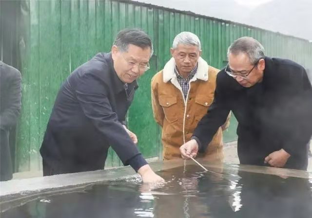 在寒冷的冬季,奔涌的熱泉給當地人民和黨委政府帶來(lái)一陣陣暖意。廣安市委書(shū)記李建勤來(lái)到項目施工現場(chǎng),聽(tīng)取地熱勘探試驗井有關(guān)情況介紹,詳細詢(xún)問(wèn)項目推進(jìn)、鉆井施工工藝與過(guò)程、抽水試驗等情況,現場(chǎng)測試水溫、察看水量,并代表市委、市政府對地勘一線(xiàn)職工表示感謝。