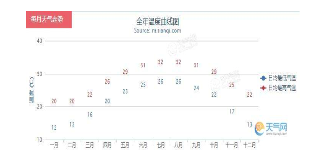 圖注:深圳全年溫度曲線(xiàn)圖,冬季氣溫最低氣溫13--22度之間