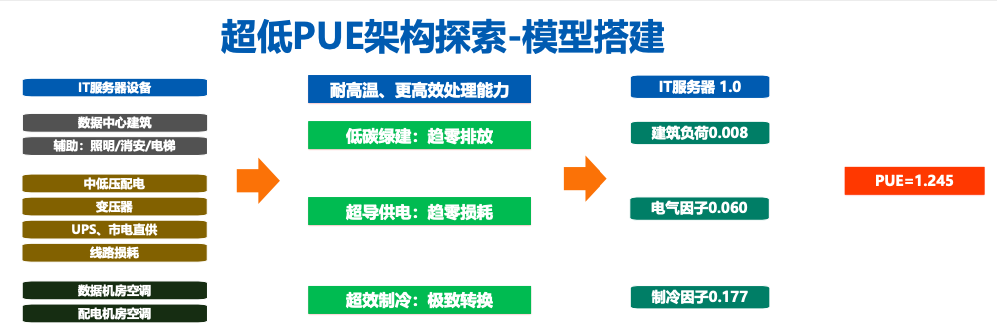 熟悉設計流程的專(zhuān)業(yè)人員都知道,數據中心里主要的設備是包含風(fēng)電、制冷、IT,都屬不同專(zhuān)業(yè)、不同團隊的人來(lái)設計實(shí)施。其中,絕大部分設計院也不設計IT部分,而IT的負載通常是恒定值。為此,深總院搭建的能耗模型主要分為三個(gè)部分:建筑、電氣、制冷。從綠色建筑層面來(lái)講,目前低碳綠建趨勢下,排放的趨勢趨零。因此,降低PUE主要集中在電氣和制冷兩個(gè)層面:在電氣領(lǐng)域,需要高能效的設備和最短的傳輸;在空調系統也是如此,超高效制冷,極致轉換,這兩個(gè)領(lǐng)域本質(zhì)上都是將最簡(jiǎn)單的設備和最低的功耗結合起來(lái),每一部分的PUE都控制到一定數值,最終實(shí)現整體PUE值的降低。