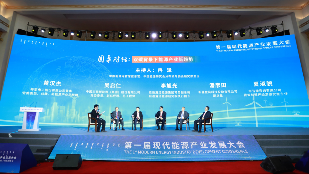 在本次大會(huì )的圓桌對話(huà)環(huán)節,中國能源網(wǎng)首席信息官、中國能源研究會(huì )分布式專(zhuān)委會(huì )研究部主任冉澤,特變電工股份有限公司董事、黨委委員、總裁、新能源產(chǎn)業(yè)總經(jīng)理黃漢杰,中國三峽新能源(集團)股份有限公司黨委委員、副總經(jīng)理、總工程師吳啟仁,啟迪清潔能源集團常務(wù)副總裁、啟迪清潔能源研究院執行院長(cháng)李旭光,新疆金風(fēng)科技股份有限公司副總裁潘彥田,中節能咨詢(xún)有限公司能效與循環(huán)經(jīng)濟研究室主任夏淑貌共同探討了“雙碳背景下能源產(chǎn)業(yè)新趨勢”。
