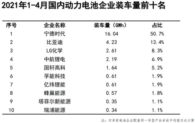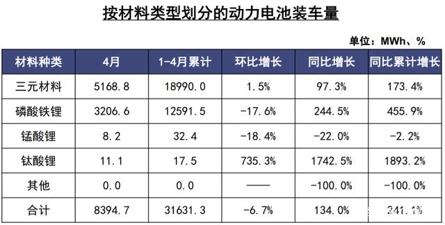 今年前4個(gè)月,我國動(dòng)力電池裝車(chē)量累計31. 6GWh,同比累計上升241.1%。其中三元電池裝車(chē)量累計19GWh,占總裝車(chē)量60%,同比累計上升173.4% ;磷酸鐵鋰電池裝車(chē)量累計12.6GWh,占總裝車(chē)量39.8%,同比累計上升455.9%。
