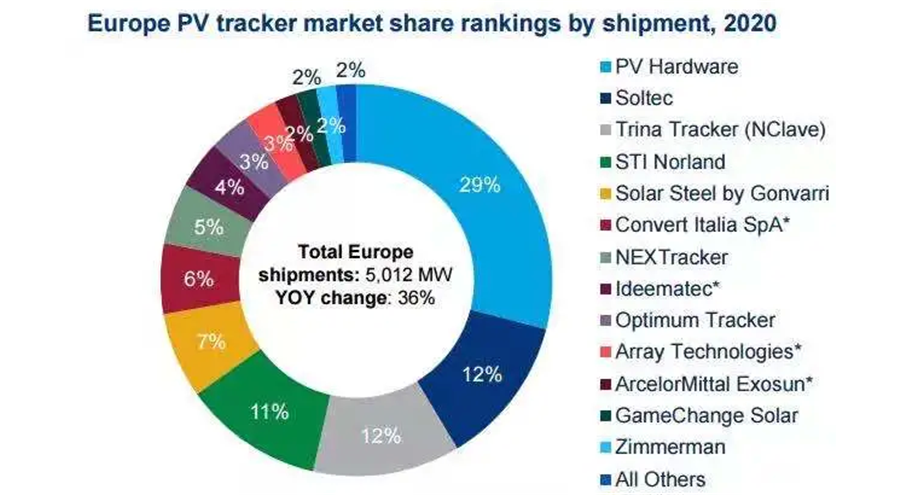 2020年歐洲地區的出貨量占全球的11%,達到了5GW。與2019年相比,市場(chǎng)更加分散和多元化。PV Hardware以29%的市場(chǎng)份額占據了頭部位置。Soltec和Trina Tracker則以微小的差距分別排在了第二和第三。