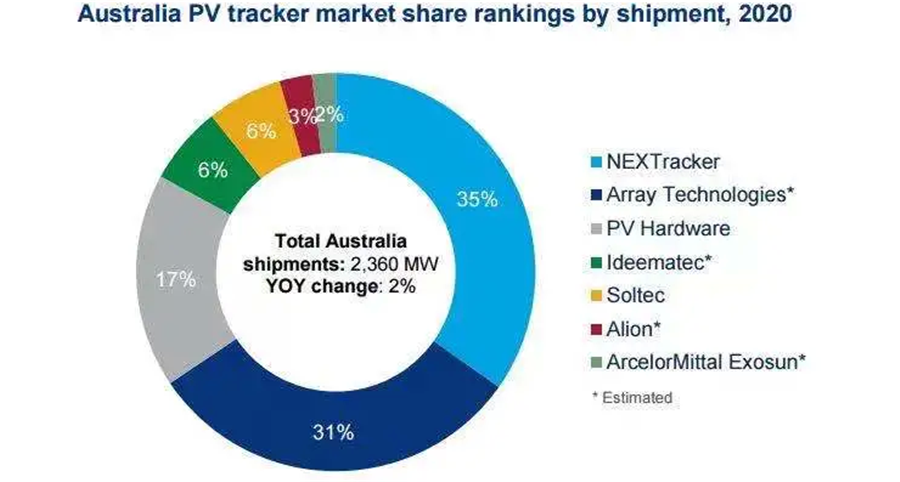 與去年相比,2020年澳大利亞市場(chǎng)僅增長(cháng)了2%,出貨量為2.36GW。NEXTracker和Array Technologies分別以35%和31%的市場(chǎng)份額排在前兩名。PV Hardware以17%的份額排在第三。