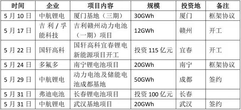 中航/弗迪/多氟多領(lǐng)銜5月電池項目投資總規模超百GWh