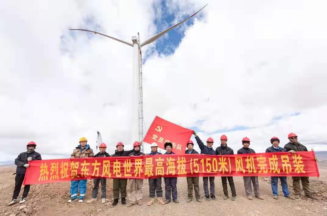 6月6日,世界最高海拔風(fēng)電場(chǎng)——西藏措美縣哲古分散式風(fēng)電項目現場(chǎng)傳回捷報:東方風(fēng)電為該項目研制的2.X-131型永磁直驅風(fēng)電機組順利完成吊裝,機位海拔高度5060米,機組輪轂中心海拔高度5150米,是目前世界安裝海拔高度最高的風(fēng)電機組,標志著(zhù)東方風(fēng)電已完全具備超高海拔風(fēng)電機組自主研發(fā)、制造、安裝能力,實(shí)現挑戰5000米以上超高海拔風(fēng)電“無(wú)人區”的歷史性跨越,這是東方風(fēng)電勇?lián)?ldquo;碳達峰”“碳中和”宏偉目標使命,推動(dòng)新能源發(fā)展的又一重大成果。