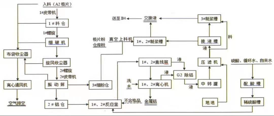 鋁渣為A3車(chē)間提取三元廢舊電池極片上的鎳、鈷、錳過(guò)程中所產(chǎn)生的附屬產(chǎn)品。邦普科技公司2018年8月15日開(kāi)始執行的鋁渣生產(chǎn)工藝流程為:廢舊電池極片從A2車(chē)間輸送至A3車(chē)間進(jìn)入1#料倉,經(jīng)過(guò)細破機,廢舊極片被打成小碎片(2012年12月22日開(kāi)始執行的工藝前期流程為:廢舊電池極片經(jīng)過(guò)粗破機破碎后,先后經(jīng)過(guò)電加熱鋼帶爐和錘片式破碎機,被打成小碎片。后續工藝流程不變),在碾壓撕扯中,部分鋁箔和表面粉料被機械分離,物料經(jīng)過(guò)振動(dòng)篩,篩上物為鋁渣,鋁渣表面附著(zhù)大量的正極材料,篩下的極片粉料直接送往B4車(chē)間制漿,用于后續工藝。鋁渣輸送到反應釜中與稀硫酸(0.5mol/L)混合,經(jīng)過(guò)20分鐘的高速攪拌,使鋁渣和粉料分離。固液混合物經(jīng)過(guò)直線(xiàn)篩后,鋁渣送至離心機洗水、甩干,鋁渣裝袋后送至危險廢物暫存庫待檢區,剛出來(lái)未冷卻的鋁渣不允許堆垛,檢測合格后才允許在危險廢物暫存庫存放區堆碼(在待檢區主要檢測鈷鎳殘指標,最終鋁渣的鈷鎳殘留總含量控制標準在4%以下為合格,檢測結果一般需要一天)。鋁渣儲存數量達到裝車(chē)要求后,直接向外銷(xiāo)售。