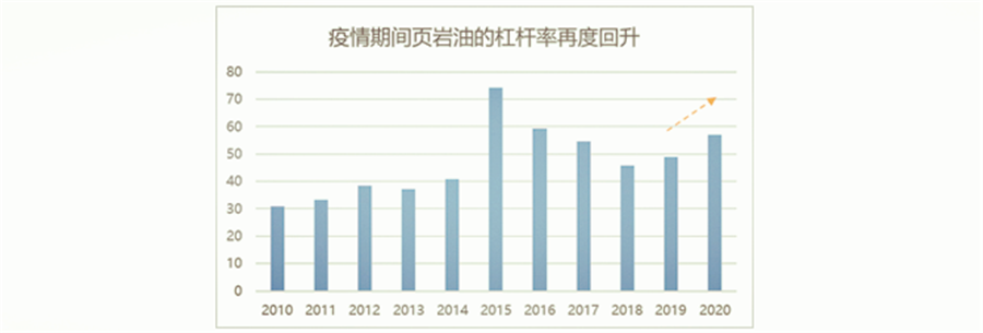 頁(yè)巖油行業(yè)的總體杠桿率一直比較高,2015年最高達到過(guò)74.3%。2020年受疫情影響,過(guò)高的負債使得行業(yè)平均杠桿率由19年的48.8%回升至57%。
